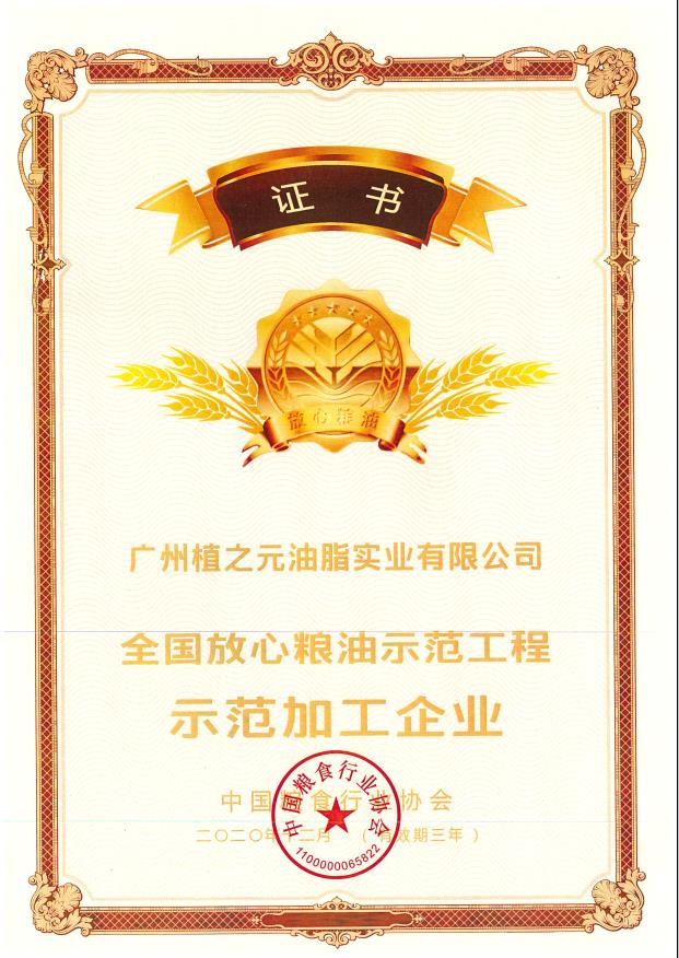 全国放心粮油示范工程示范加工企业证书